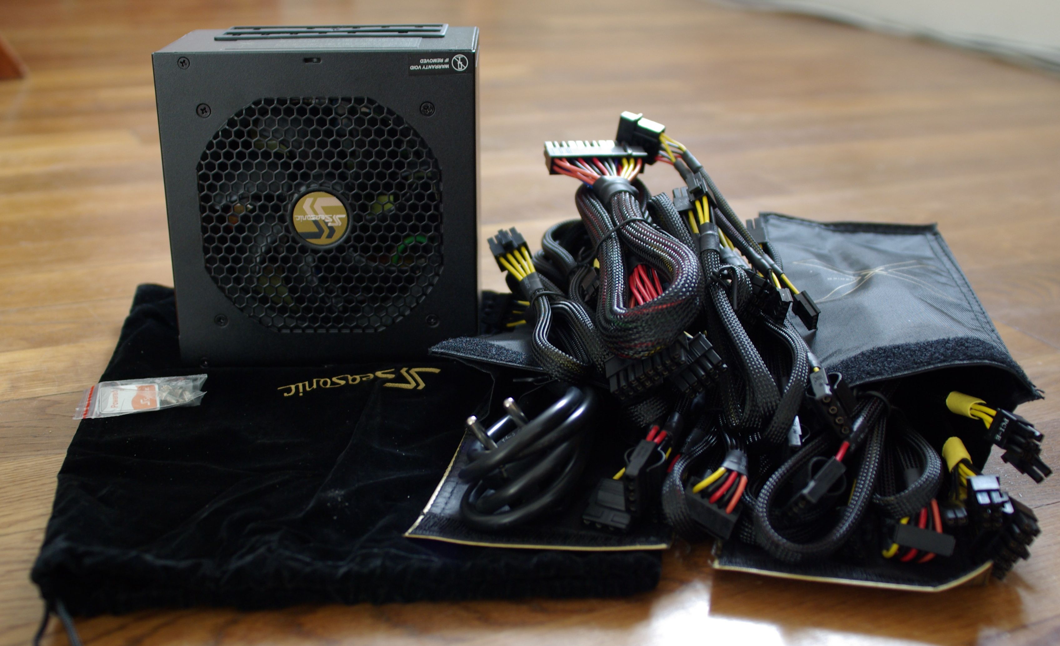 2. Bundle de la Seasonic X series 650W 80+ goldCâbles électriquesLa Seasonic X series 650 W 80+ gold est une alimentation modulaire "haut de gamme", et le Bundle est là pour nous le rappeler. En plus d´une garantie constructueur de 5 ans, Le fabriquant a pris soin de flatter la vue de ses clients, et n´a pas hésité à placer l´alimentation dans un écrin noir du plus bel effet. Autant dire que ca en jette, surtout lorsqu´on découvre deux sacs dans lesquels se logent les différents câbles. Et comme on peut le constater sur la figure suivante, ils sont nombreux ! Photo du Bundle accompagnant l\´alimentation (cliquer pour agrandir) Même des vis de fixations sont présentes ! C´est donc avec une excellent impression qu´on découvre ce produit. L´alimentation en elle même est un peu plus longue (16 cm) que l´ancienne Antec Neopower (14 cm), mais elle est modulaire jusqu´aux câbles d´alimentation de la carte mère ! Voici d´ailleurs le détail des câbles fournis :