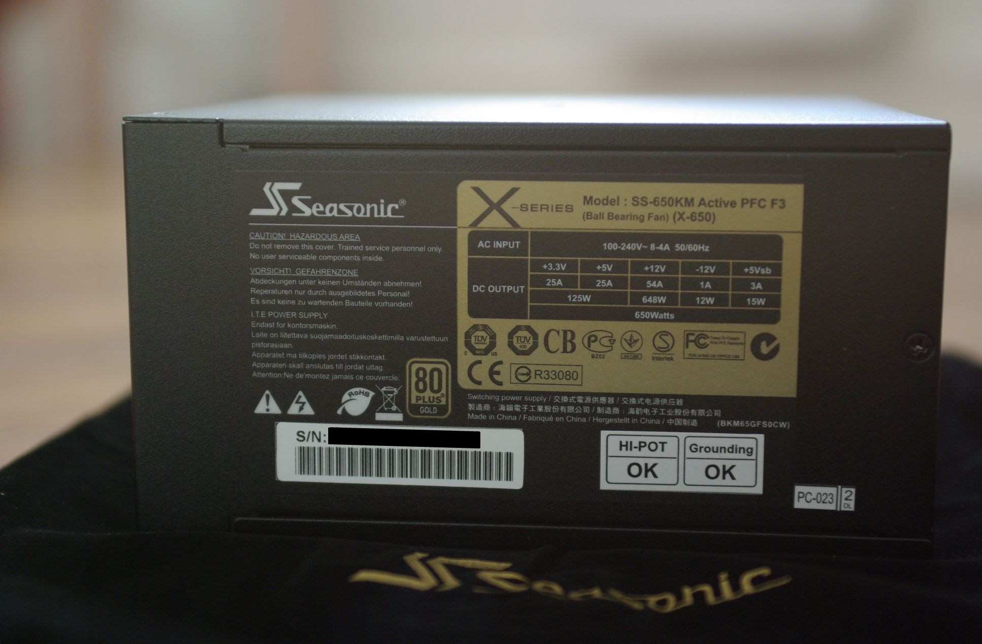 Finalement, on sent qu´on a affaire à un produit de qualité, bien pensé, avec une finition impeccable. Evidement, on pourrait lui faire quelque petits reproches... principalement, l´absence de compte tour ou encore un dispositif de contrôle des ventilateurs de boitier. Caractéristiques électriquesSeasonic annonce ce modèle pour 650 W... ce dont on dispose en utilisation maximale permanante ! C´est encore mieux que l´Antec Neopower, qui était annoncée à 480 W et qui supportait jusque 460 W (voir ici). Caractéristiques annoncées (cliquer pour agrandir) Pour chaque tension fournie, le courant maximal est indiqué : on peut donc estimer la puissance en pic à 880 W ! Là encore, cette valeur est largement supérieure à la puissance nominale (650 W), comme toute alimentation qui se respecte. Cette dernière est annoncée Active PFC (le courant consommé est "en phase" avec la tension du secteur), et un logo "80+ gold" est présent sur le flan droit (Rapport de 80plus.org2). Le rendement est donc supérieur à 87 %. Afin de préserver la garantie (5 ans), nous n´avons pas ouvert le bloc. 2 : Curieusement, l´image correspondant à l´alimentation est non modulaire... pourtant, la référence SS-650KM est bien la bonne (voir la photo juste au dessus).