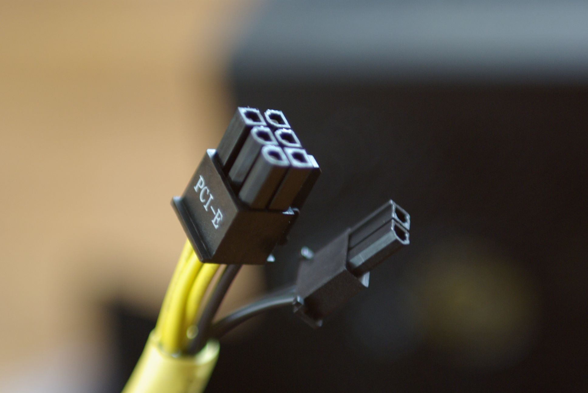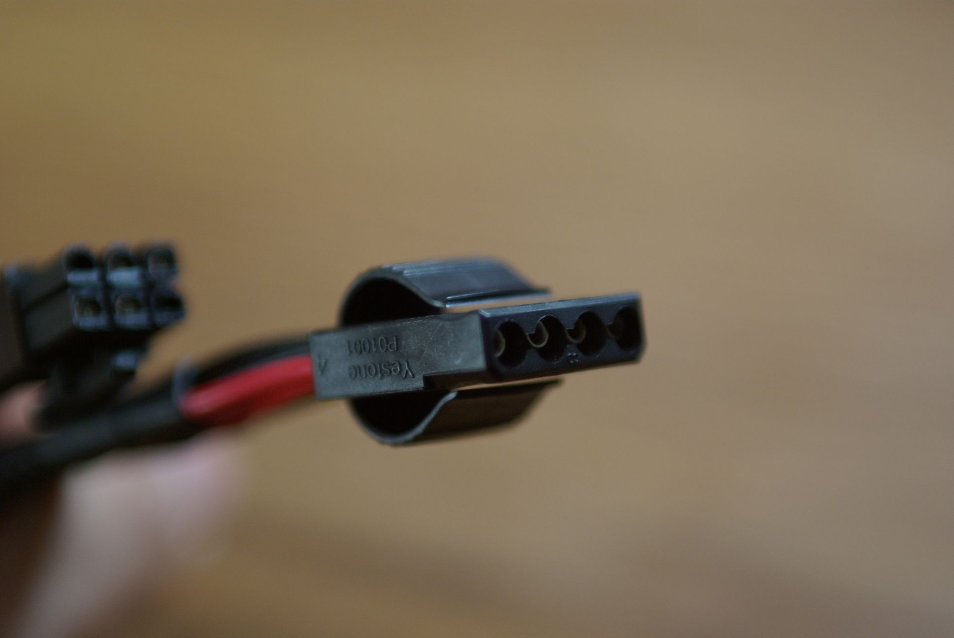 Ces derniers sont tous gainés d´une tresse noire et on ne peut s´empêcher de constater que les connecteurs ont été pensés pour être pratiques, avec la possibilité de passer de 20 à 24 pins pour l´alimentation, ou encore de passer de 6 à 8 pins pour les ports PCI-E (photo ci-après). D´ailleurs, le nombre de câbles pour les cartes vidéo est suffisant pour envisager un CrossFire ou un SLI de cartes nécessitant une double alimentation chacune ! Un autre détail bien pensé : les prises Molex possèdent des oreilles sur lesquelles appuyer pour faciliter leur démontage ! Là encore, c´est très pratique ! Photo du Bundle accompagnant l´alimentation et caractéristiques annoncées (cliquer pour agrandir) La peinture du bloc est mate, avec un effet "granuleux". La grille sous le ventilateur est en nid d´abeille, très aéré, tandis que celle à l´arrière est un peu moins "ouverte" (trous hexagonaux plus petits). Après autant d´éloges, on peut cependant noter deux points :