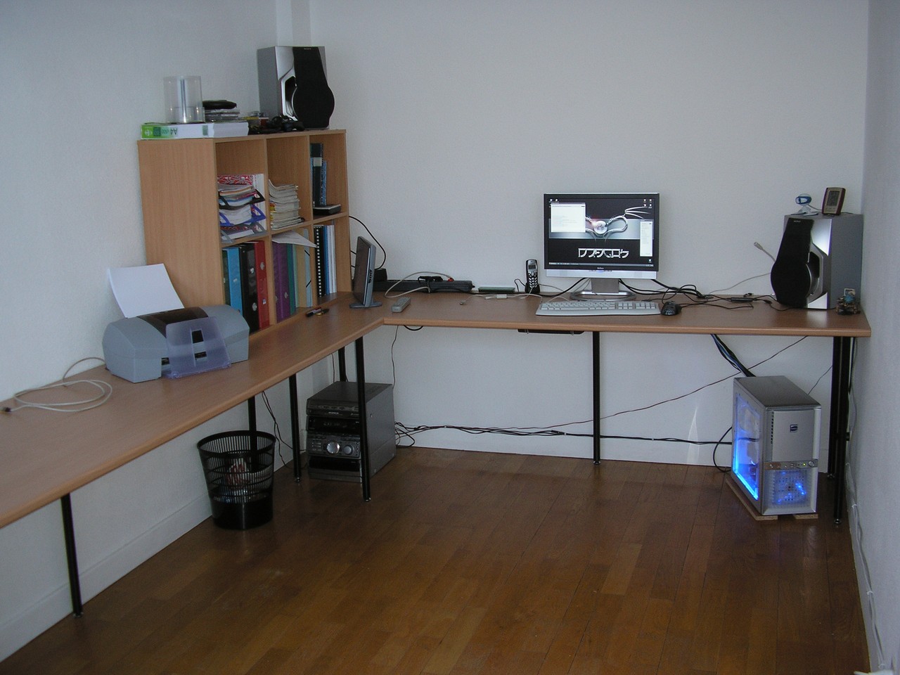 Ajout de 2 Zalman ZM-OP1 pour optimiser la ventilation (cliquer pour agrandir) Pour aller encore plus loin, tous les ventilateurs sont ralentis soit par le QFan de la carte mère soit par un Rhéobus : la tension des ventilateurs est de l´ordre de 6V pour tous, alim comprise ! L´utilisationHormis mon PC et ce qui gravite autour, il n´y a chez moi aucun appareil HiFi : exit le magnétoscope, le lecteur DVD/DivX, ou la HiFi dédiée (platine Vinyle, CD, DVD, K7, Tuner...). Seule une petite TV (36 cm) fait de la résistance, histoire de voir les infos : on ne peut pas dire que ce soit du grand écran ou du Home Theatre ! En contrepartie, c´est le PC qui est au centre de mon univers numérique, et c´est donc lui qui doit s´acquitter de toutes les tâches, ce qui explique la taille de l´écran et l´environnment sonore qui l´accompagne. Au passage, cette solution est nettement plus économique, car de toute façon, je ne peux pas me passer du PC, donc autant faire l´économie des appareils dont les fonctions font doublon. Bureau Home Made : le PC au centre de mon univers multimedia (cliquer pour agrandir) La connexion Internet est bien sûr en haut débit ADSL2+, avec un Routeur-Firewall-WiFi derrière. La connexion des différentes machines se fait via un switch 1Gb 5 ports : le réseau est donc prêt pour accueillir les 3 autres machines de mes proches pour des parties acharnées de Warcraft III... Une légère touche "Jacky"Je ne suis pas trop pour le tuning sauvage qui revient à tout modifier, avec un goût souvent discutable. Avant tout, ma machine doit répondre à mes exigences de silence et de confort : l´esthétique est certes important, mais moindre. Le choix du boitier a été tout à fait personnel, mais il correspondait avant tout à d´autres critères (ventilation, poids, montage...). Désormais, la plupart des pièces de mon PC sont assorties, de couleur noir couplé ou gris, sauf le clavier (mais je l´aime bien, celui-là). Manque encore une zapette pour le contrôle de la video, mais celà devrait être corrigé d´ici peu.