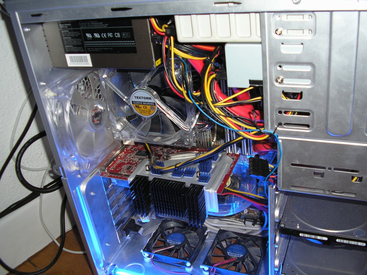 2. La machine de l´auteur du siteHistoire de la machineUne machine qui date un peu (2003)...A la base, il s´agissait d´un boitier noname avec une alim 480 W (qui a rendu l´âme depuis), 512 Mo de RAM et une 9600 Pro de 128 Mo. Le stockage était alors de 120 Go. Du classique au premier prix pour l´époque. Par contre, j´avais volontairement investi dans LA carte mère du moment, avec d´excellents tests, dont un sur X86-secret.com, à savoir une P4P800 Deluxe. J´envisageais déjà d´avoir à effectuer du multi-tâche et l´arrivée des P4 avec HyperThreading était providentielle. J´ai donc délibérément investi dans le plus petit modèle, pour des raisons de prix (240 € à l´époque), mais aussi dans l´idée de l´overclocker. Naturellement, je me suis fait la main en OC sur cette machine : il s´est avéré que le 2.4C pouvait tourner parfaitement à 3GHz ! J´avais donc un processeur plutôt véloce, avec une bonne carte mère. J´ai aussi rapidement compris que pour travailler efficacement sur un PC, il est préférable que ce dernier ne soit pas très bruyant... et cela n´allait pas avec mon ventirad qui montait en régime avec la fonction QFan activée. J´ai donc attaqué les modifications de mon boitier Noname en améliorant la ventilation et en ajoutant de la mousse, et j´ai commencé à ajouter des pièces pour refroidir efficacement la machine. Un Zalman CNPS 7000 a alors pris place dans la machine, puis un VGA Silencer, des ventilateurs additionnels... Les résultats ont été très satisfaisants, à ceci près que l´embonpoint de la machine la rendait difficilement transportable. ... mais qui a beaucoup évolué !Afin de conserver un bon niveau de performances, j´ai joué la carte de l´évolutivité en remplaçant une partie de la machine chaque année. C´est ainsi que je suis passé à 1 Go de RAM, puis en Corsair XMS Cas 2 (les puces TCCD permettait de fonctionner à 250 MHz voire plus, ce qui tombait bien dans mon cas), pour finir à 4 de ces barettes, soit 2Go de RAM. Bref, de la mémoire qui me sert bien. La carte graphique a elle aussi été remplacée par une 9800 Pro puis une X850 XT, et à chaque fois overclockée ! Bon, ce n´était pas très utile pour les études, mais ca fait du bien de pouvoir jouer confortablement. Le stockage a pas mal évolué, en passant par 2x 80 Go en Raid0, puis 2x 250 Go (T7K250). Là aussi, j´en avais besoin : non pas que je fasse du montage video, mais plutôt qu´un certain nombre d´outils nécessaires à mes études nécessitent des fichiers de grosse taille avec des traitements à effectuer dessus. Pour le reste, l´alimentation a changé 2 fois, avec une Fortron 400 W puis une Neopower 480. Un écran Belinea 10 20 35W a récemment supplanté mon ancien 17" Acer. Le boitier a lui aussi été changé, en partie pour l´esthétique, à l´avantage d´un SuperLanboy, à la fois petit, pratique et léger. Heureusement, j´ai toujours trouvé acquéreur pour reprendre mon matériel ! La machine actuelle : objectif confort !Le silencePour ceux qui ont suivi, la machine subit un OC plutôt correct (stable des heures sous Prime95), ce qui la fait chauffer plus que de normale. Pour la X850 XT, même topo, à ceci près que la gestion d´énergie en 2D est plus efficace que pour les cartes Radeon 9x00 : on apprécie la thermo-régulation du ventilateur ! Ma règle de base : assurer un maximum d´efficacité dans la ventilation, ce qui ammène naturellement l´utilisation de ventilateurs de grande taille. C´est d´ailleurs un des critères qui m´ont permis de retenir mon actuel boitier. 120 mm est la taille de la majorité des ventilateurs sur cette machine, puisqu´il y en a 4, et tous peu bruyants (même en plein régime, exception faite de celui de l´alimentation) :