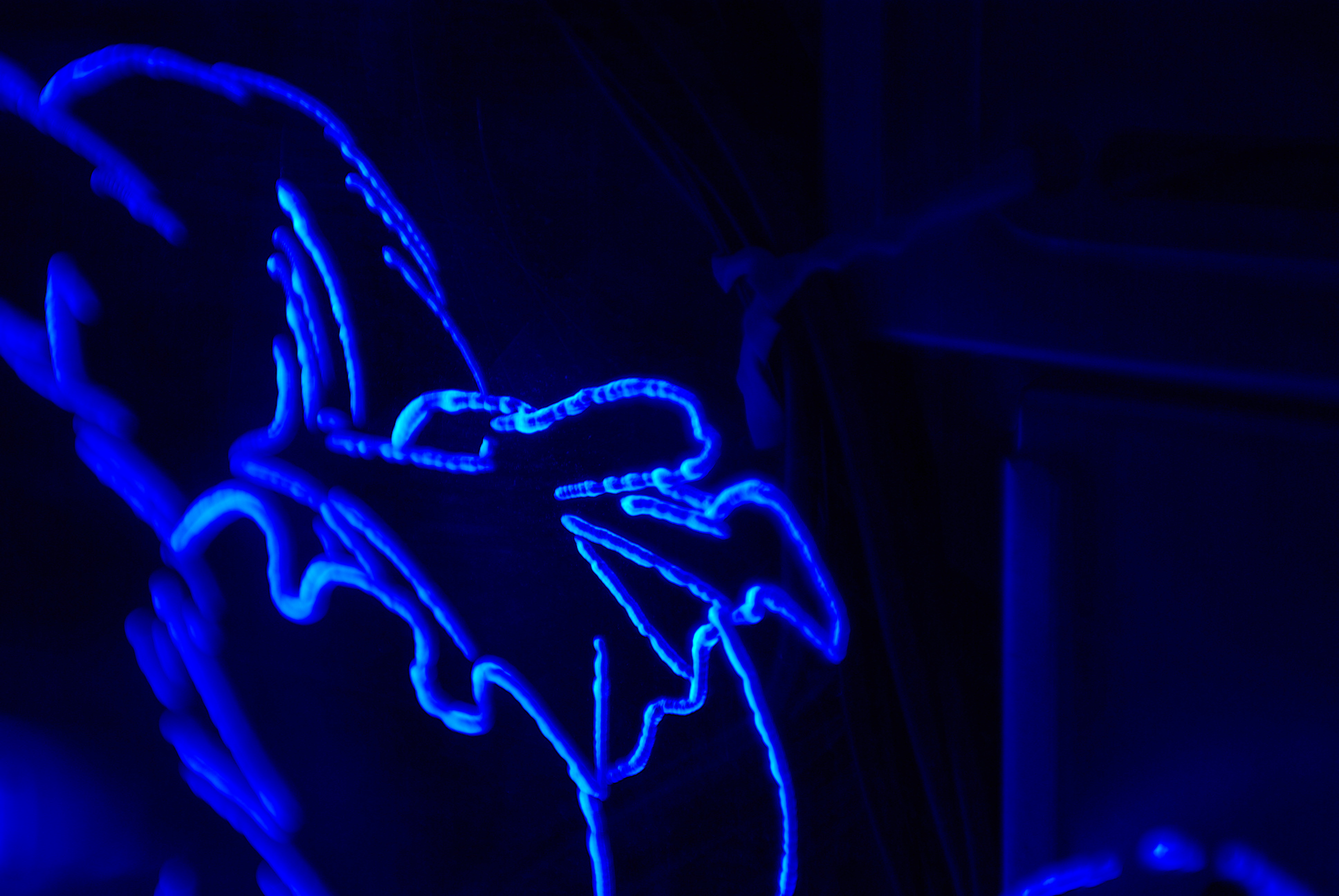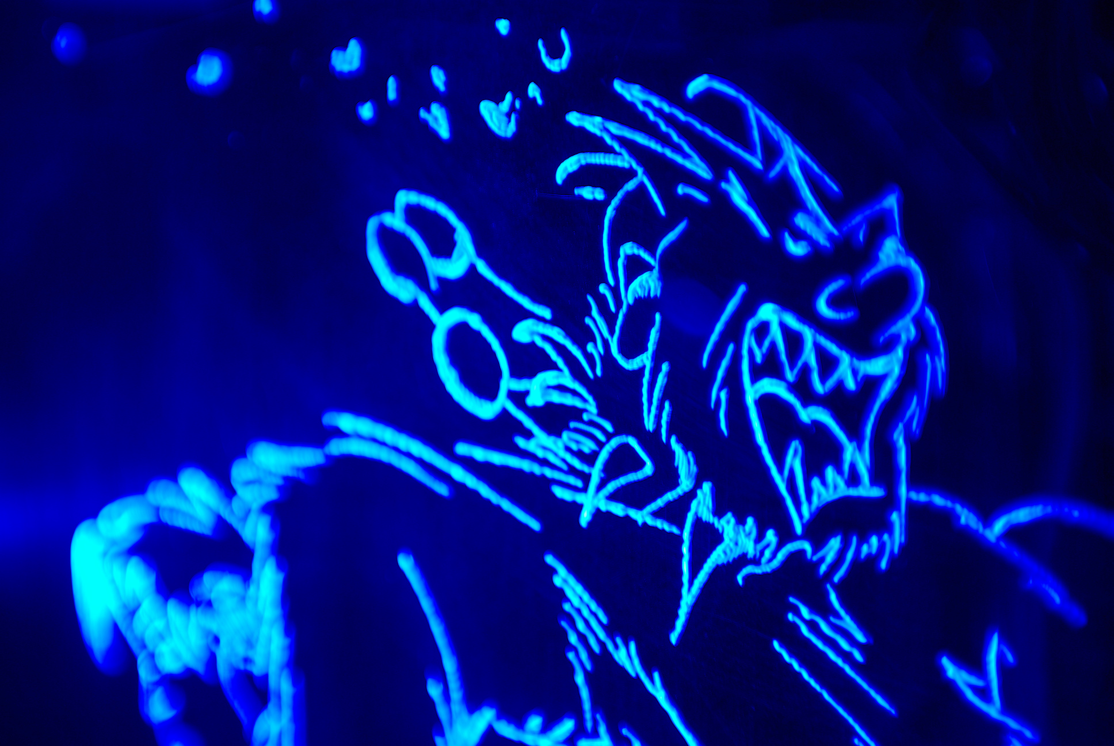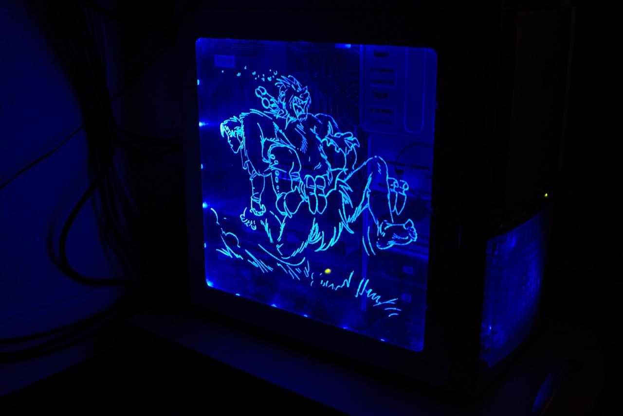 5. Rendu finalNormalement, à ce stade, on a un panneau qui fonctionne, avec le câblage opérationel ! Quide de la face gravée !Tout d´abord, on va regarder si un des cotés est plus "joli" que l´autre... On passera sur les traces de doigts involontaires qui font "nébuleuse dans l´espace" (l´auteur se reconnaitra). A gauche, la gravure est à l´extérieur, et à droite, à l´intérieur du boîtier. Les photos sont prises dans les mêmes conditions. Si on compare la luminisoté du dessin par rapport aux diodes en périphérie, on constate que celui de droite ressort davantage. De plus, si on regarde très attentivement la photo de gauche au niveau du pied, on constate que le dessin est dédoublé. ![]() Détail avec la gravure devant, à l´extérieur du boîtier : on voit clairement apparaitre un dédoublement du dessin ! Montage final et nettoyagePour tout nettoyage, on prend un chiffon doux et on supprime toutes les traces de poussière et de graisse que nos grosses paluches ont pu déposer ! Et surtout, on fait attention lors du montage à ne pas toucher la face interne du plexi... l´autre, on peut encore la (re-)nettoyer ! Le panneau une fois monté et vu de jour (cliquer pour agrandir) La même chose, dans l´obscurité : Quelques aperçus de nuit (cliquer pour agrandir) L´éclairage dans le boîtier est uniquement dû au panneau en plexiglas ! ConclusionLe montage complet prend pas mal de temps (il faut bien une journée complète), mais il semble que les résultats soient là ! On veillera à prendre les précautions nécessaires pour tout ce qui concerne la manipulation du plexiglas et la partie électrique en soignant l´isolation du montage. Pour ceux qui le souhaitent, on peut tout à fait envisager de mixer les couleurs des diodes, puisqu´on peut en trouver en rouge, vert et blanc, ou encore utiliser des diodes bicolores. Avec le câblage adéquat, on pourrait tout à faire faire clignoter partiellement ou entièrement le panneau au rythme de la musique ou d´un jeu ! Là, ca devient franchement du Jackysme... A chacun de faire selon ses envies !